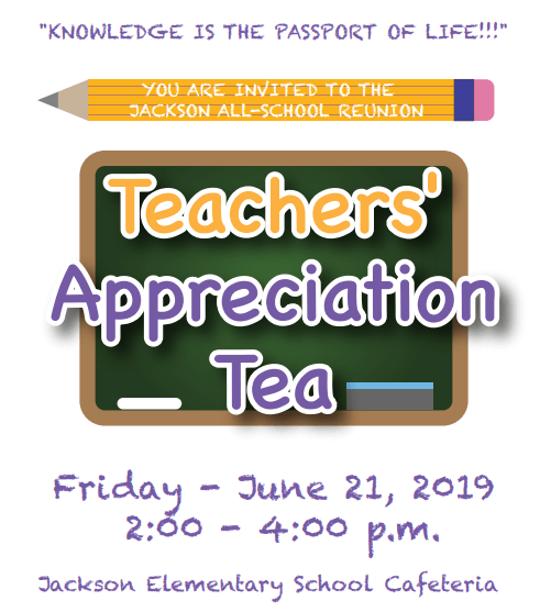 We will be having a Teachers’ Appreciation Tea at the Jackson All School Reunion on Friday, June 21, from 2 – 4 pm in the Jackson Elementary School Cafeteria